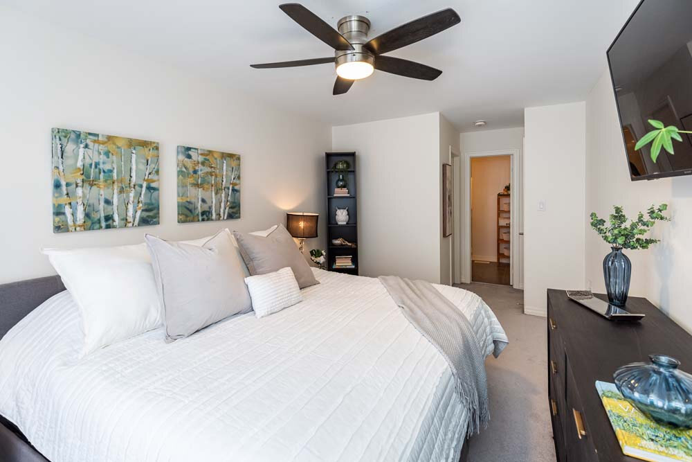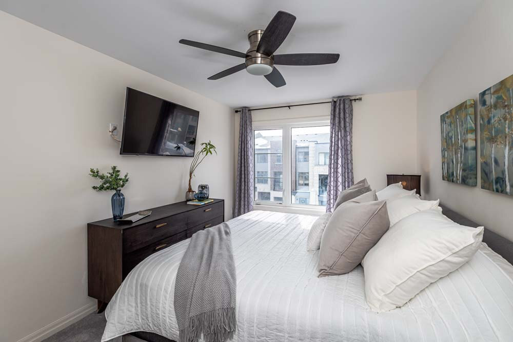The third level is your private retreat. The primary bedroom is generously sized and filled with natural light, complemented by cozy broadloom, a walk-in closet, ceiling fan, TV mount and a 3 piece ensuite. A well-sized 2nd bedroom with a walk-in closet and ceiling fan, a 4-piece bathroom and convenient laundry area complete this thoughtfully designed floor.