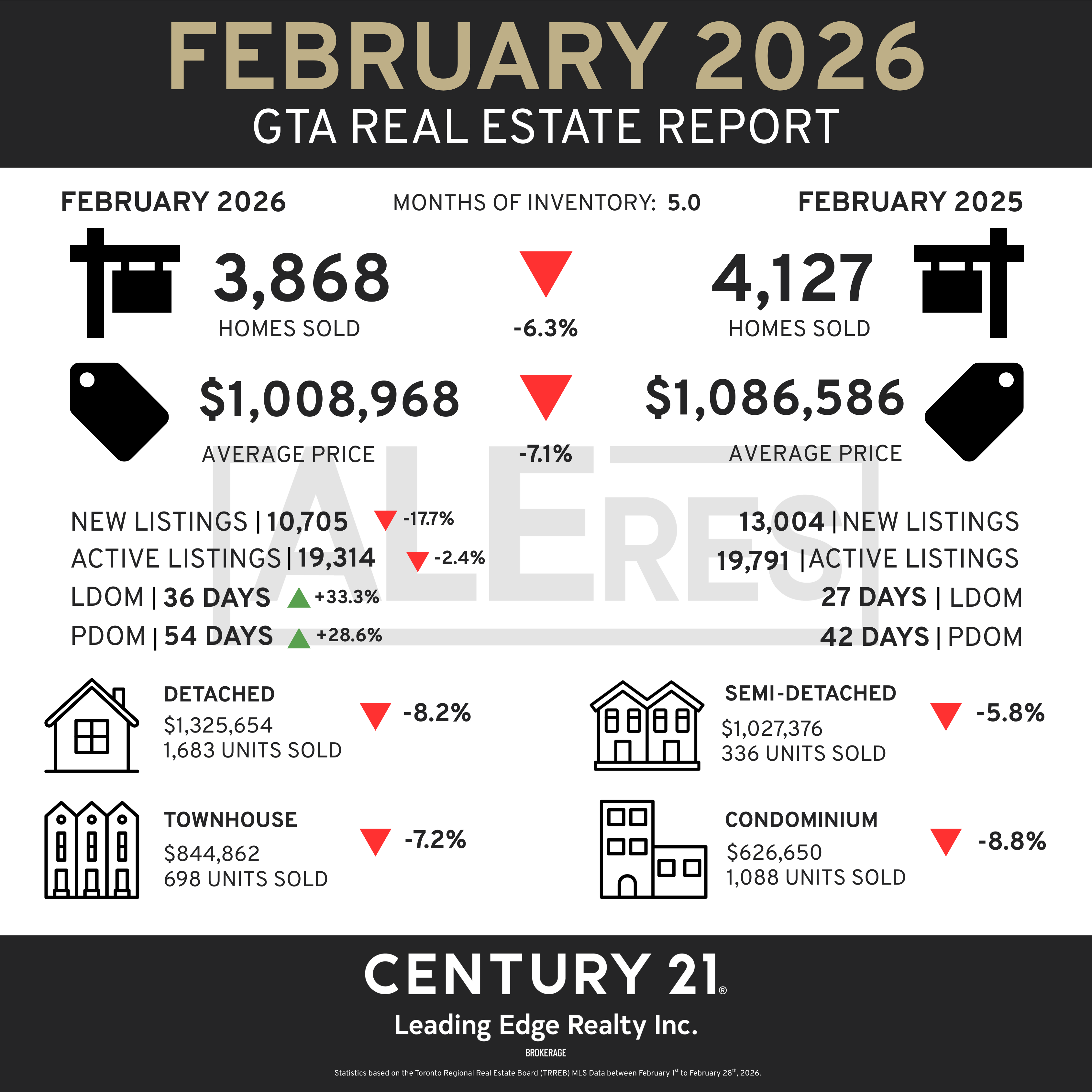 Home sales slowed – 3,868 homes sold across the GTA, down 6.3% compared to February 2025.