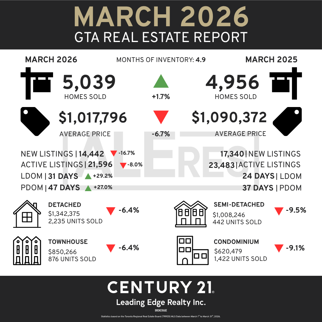 Home sales edged higher – 5,039 homes sold across the GTA, up 1.7% compared to March 2025.